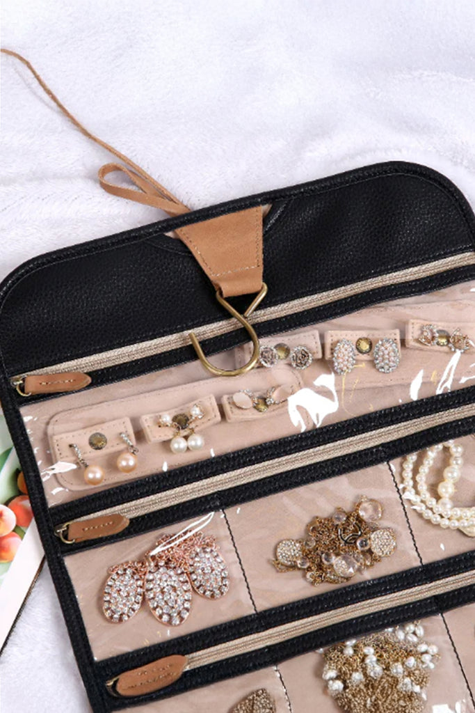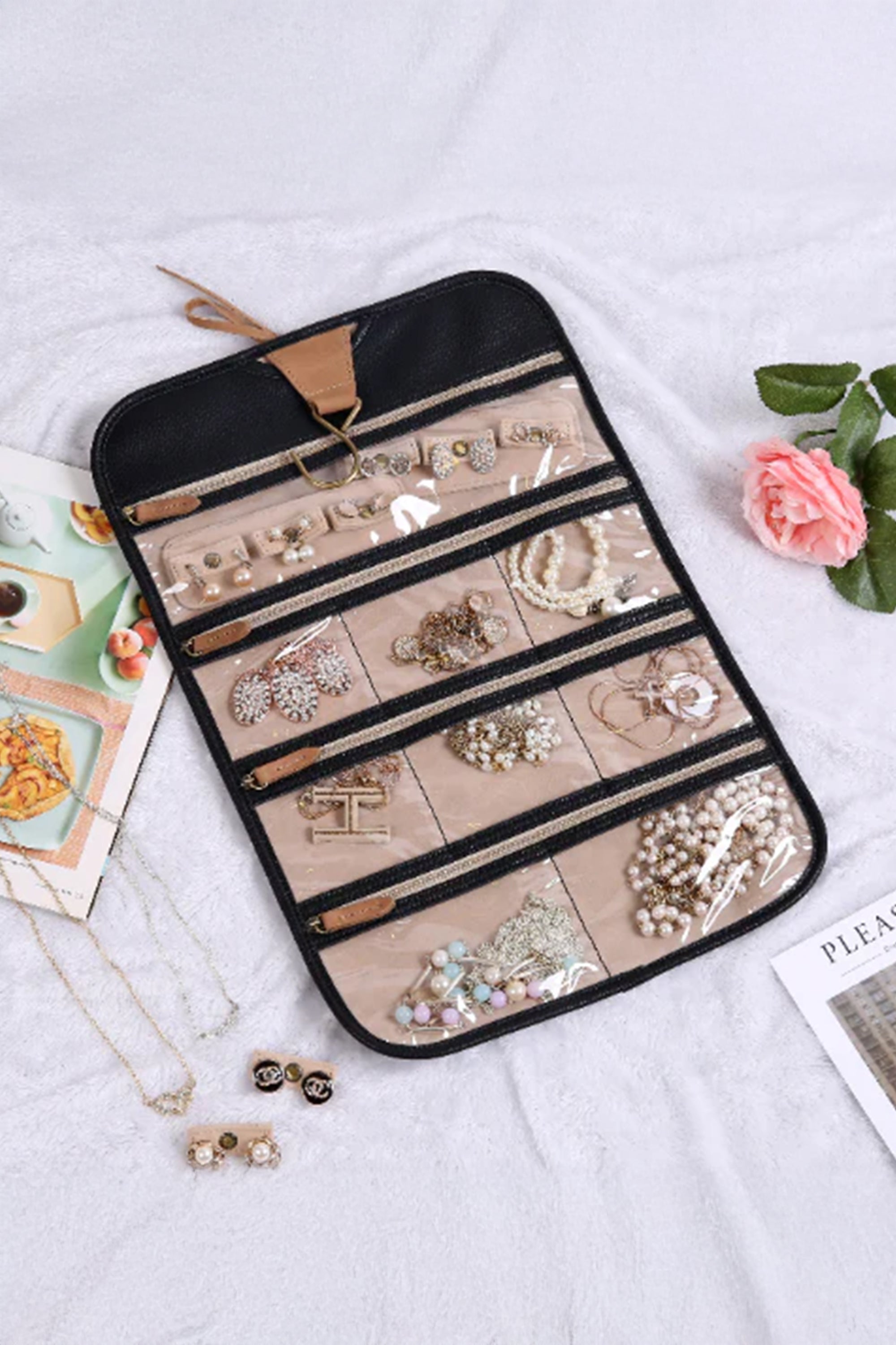 This Roll up organizer is made of vegan leather with soft velvet fabric, designed for week long travel.