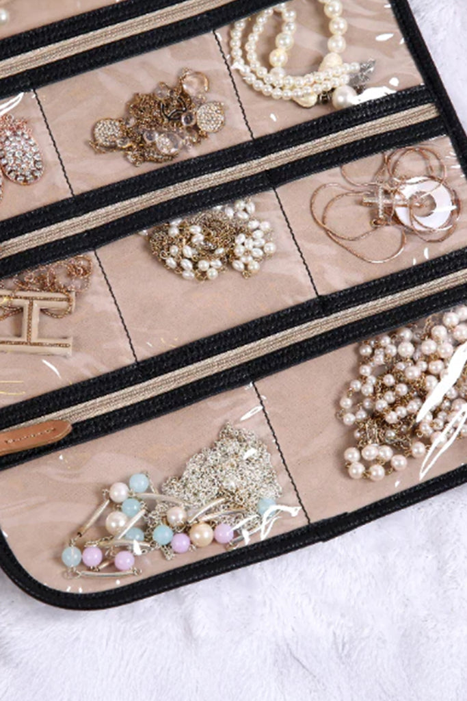 It comes with 2 boards and 9 detachable earring bars and one detachable ring bar, can hold up to 9 pairs earring and 6 rings, the boards and bars are made from soft velvet fabric, well protected with zipper and see through window; 6 small see-through zippered pouches and 2 medium pouches can hold necklaces or watches etc..