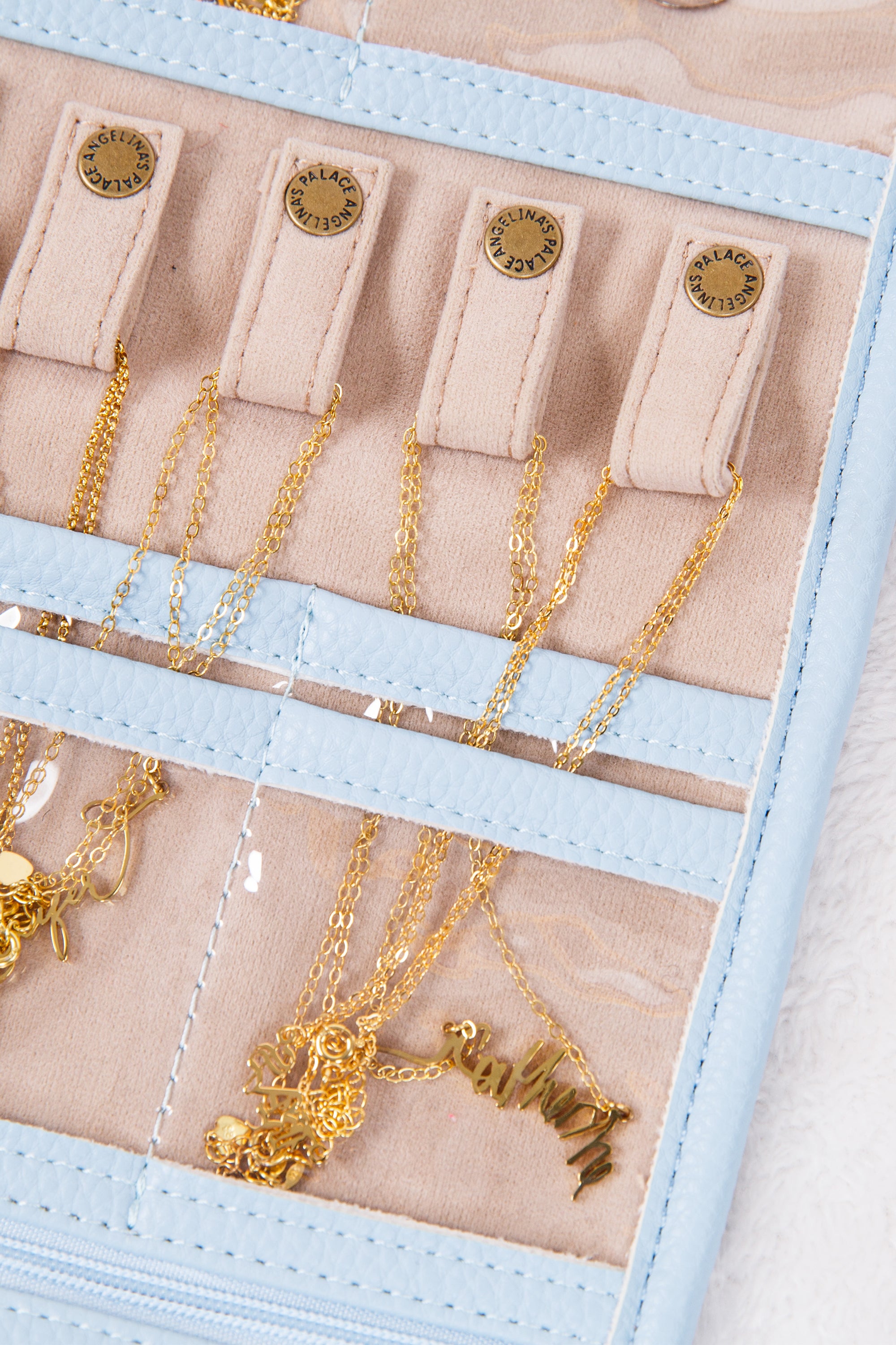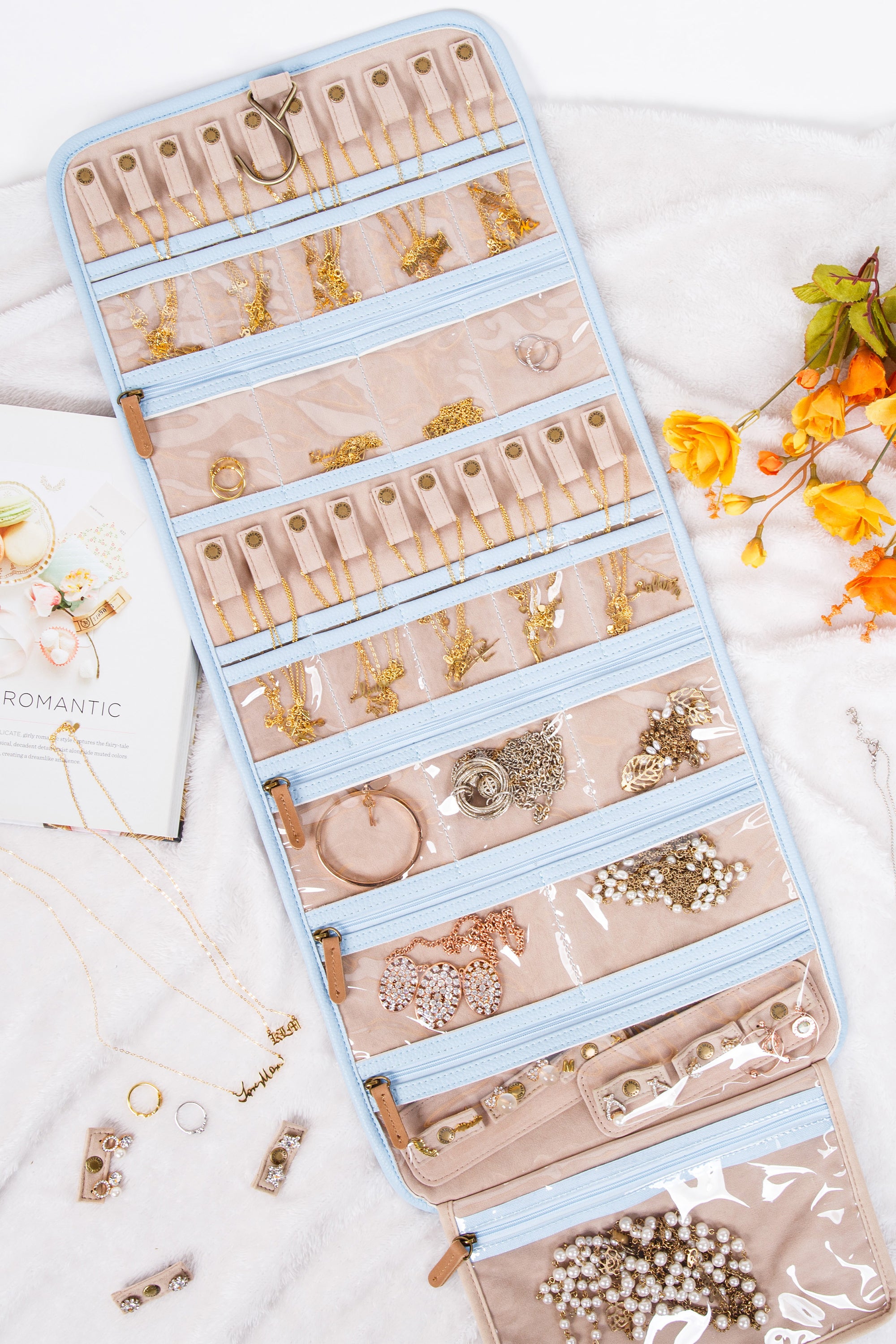 This stunning organizer boasts 20 individual see-through pockets with snap bar holders, ensuring each necklace stays untangled and well-protected. The zippered pockets include:
