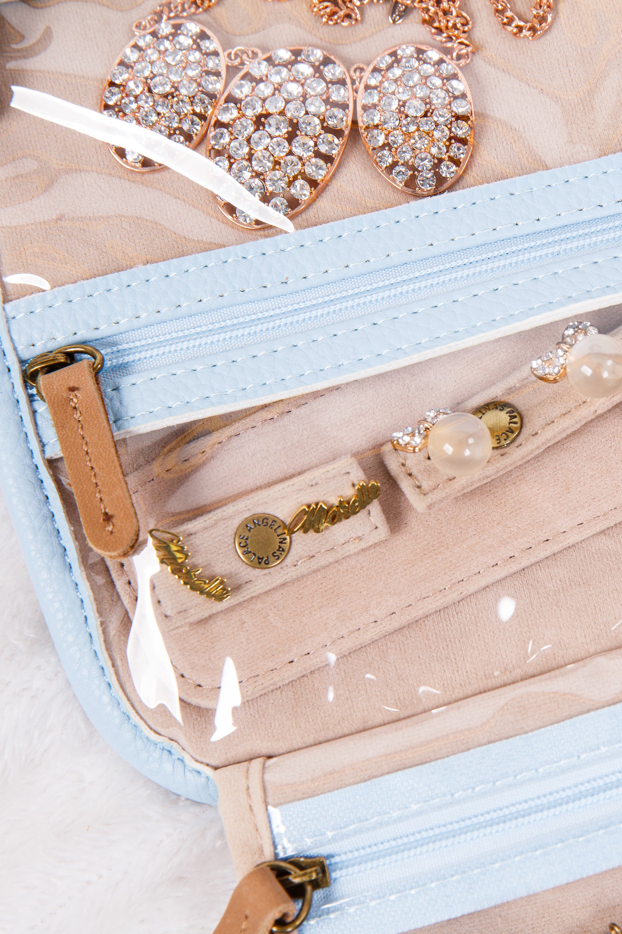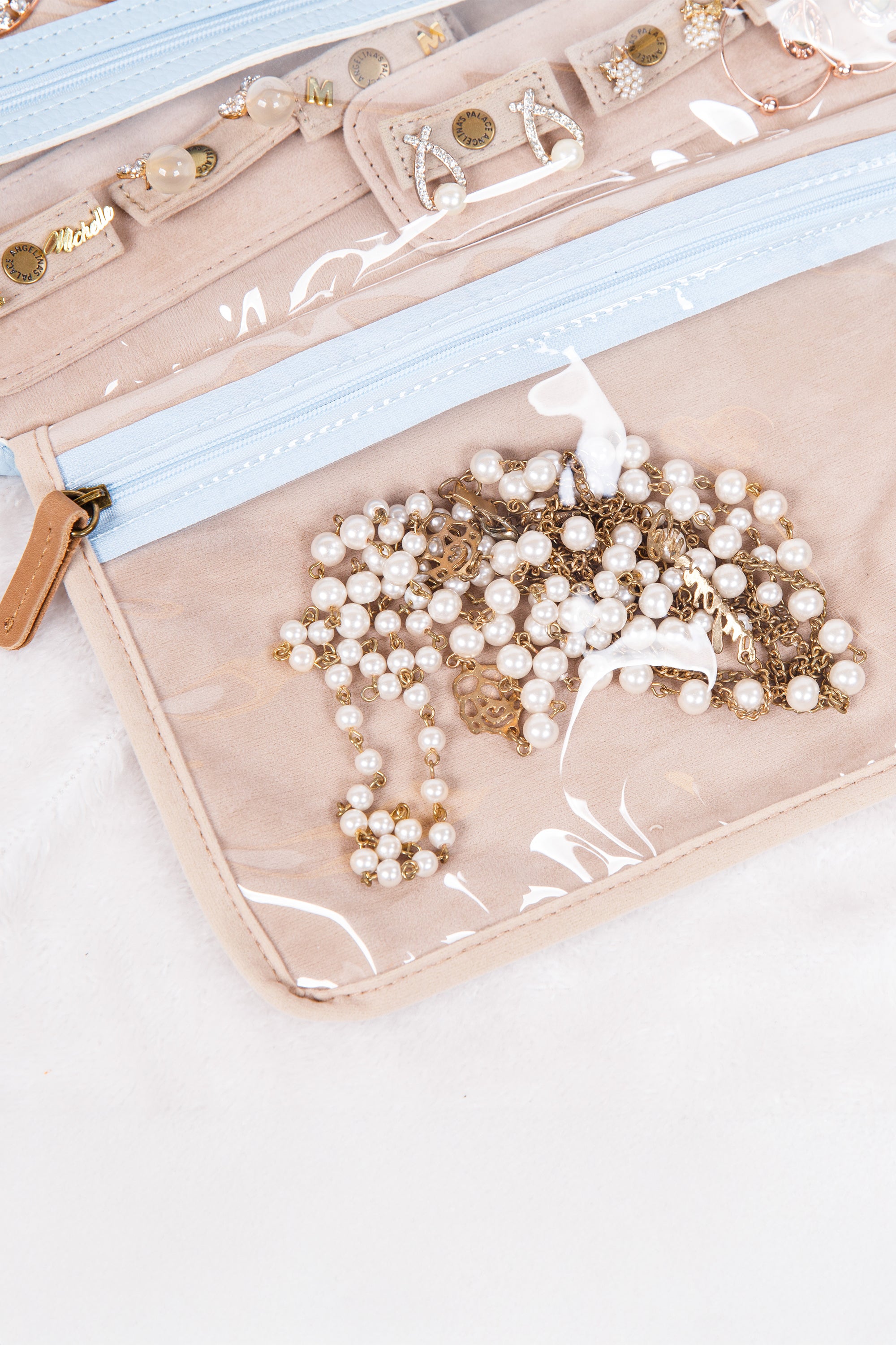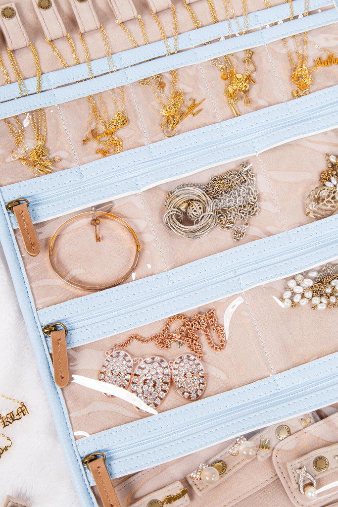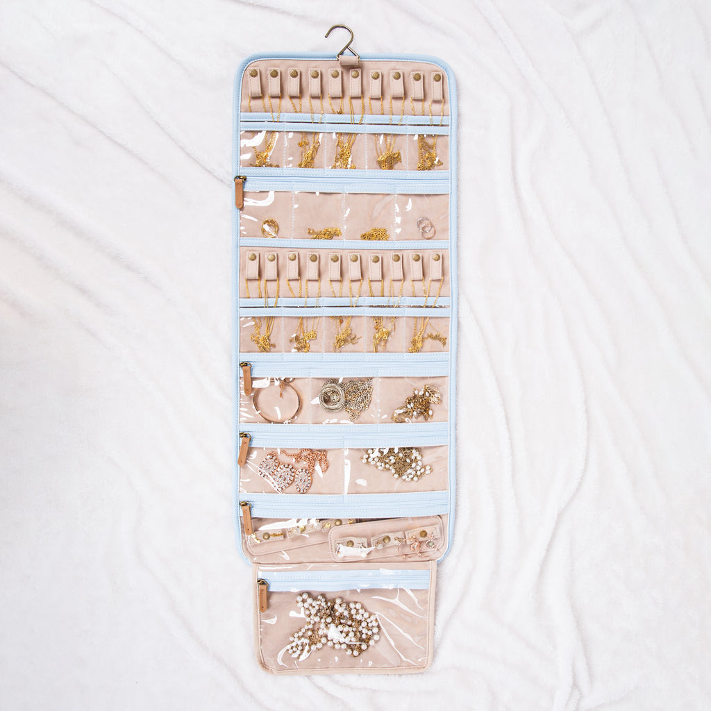 Similar to the classic medium rollup, this organizer features two boards with 9 detachable earring bars and one detachable ring bar, capable of holding up to 9 pairs of earrings and 6 rings. These boards neatly fit into the full-size zippered pocket.